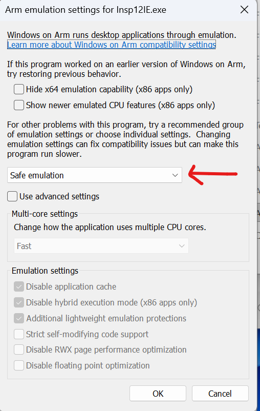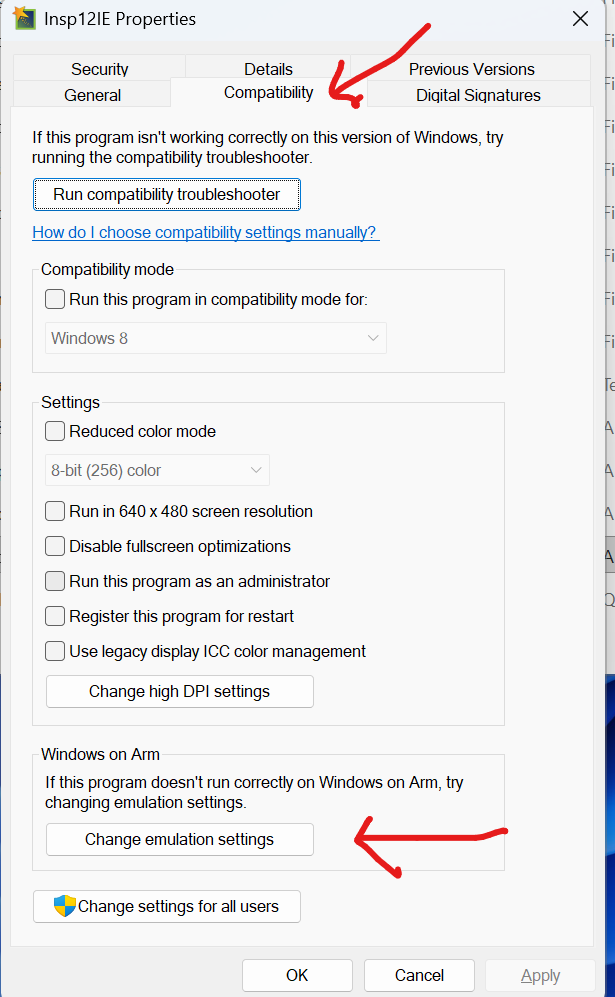 3. Click on the Compatibility tab and choose under Windows on ARM, Change emulation settings.